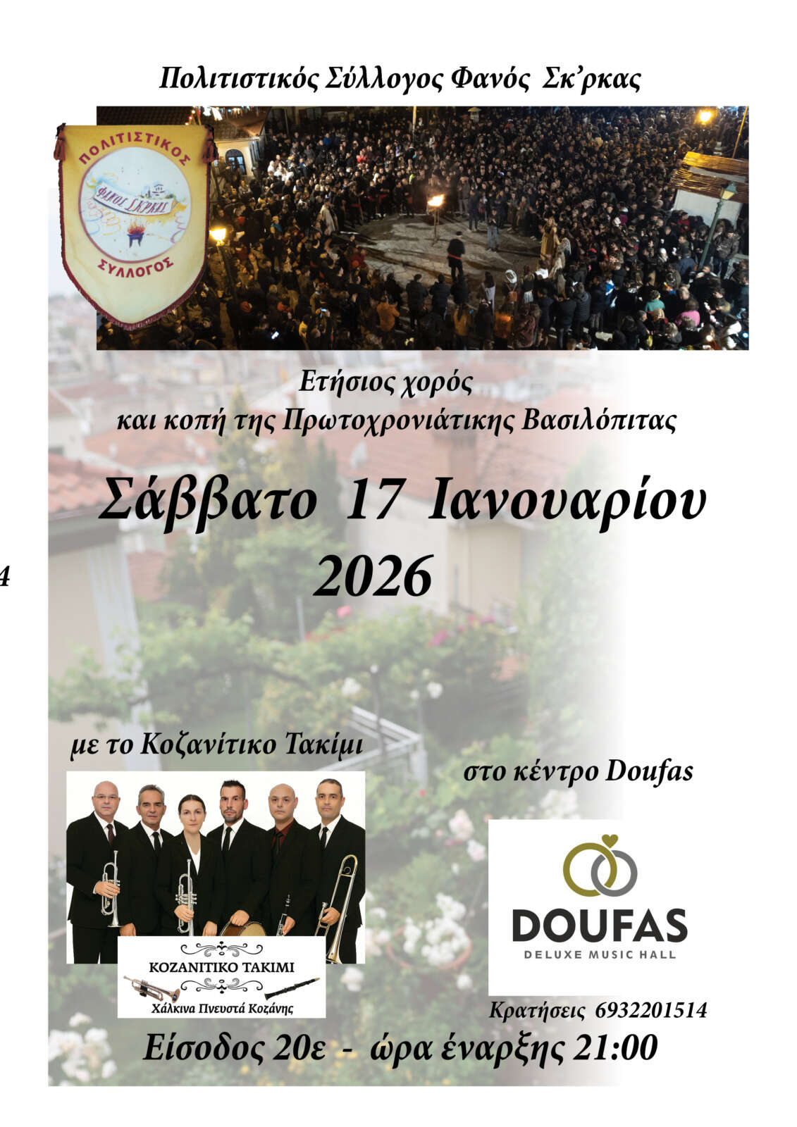 Ο Πολιτιστικός Σύλλογος Φανός Σκ’ρκας σας προσκαλεί στον ετήσιο χορό και την κοπή της Πρωτοχρονιάτικης Βασιλόπιτας,